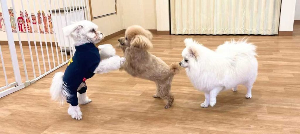 保育園では家族以外の人や様々な犬種や性格の犬と同じ空間で過ごしたり、楽しく遊んで社会性を身に着けられます。